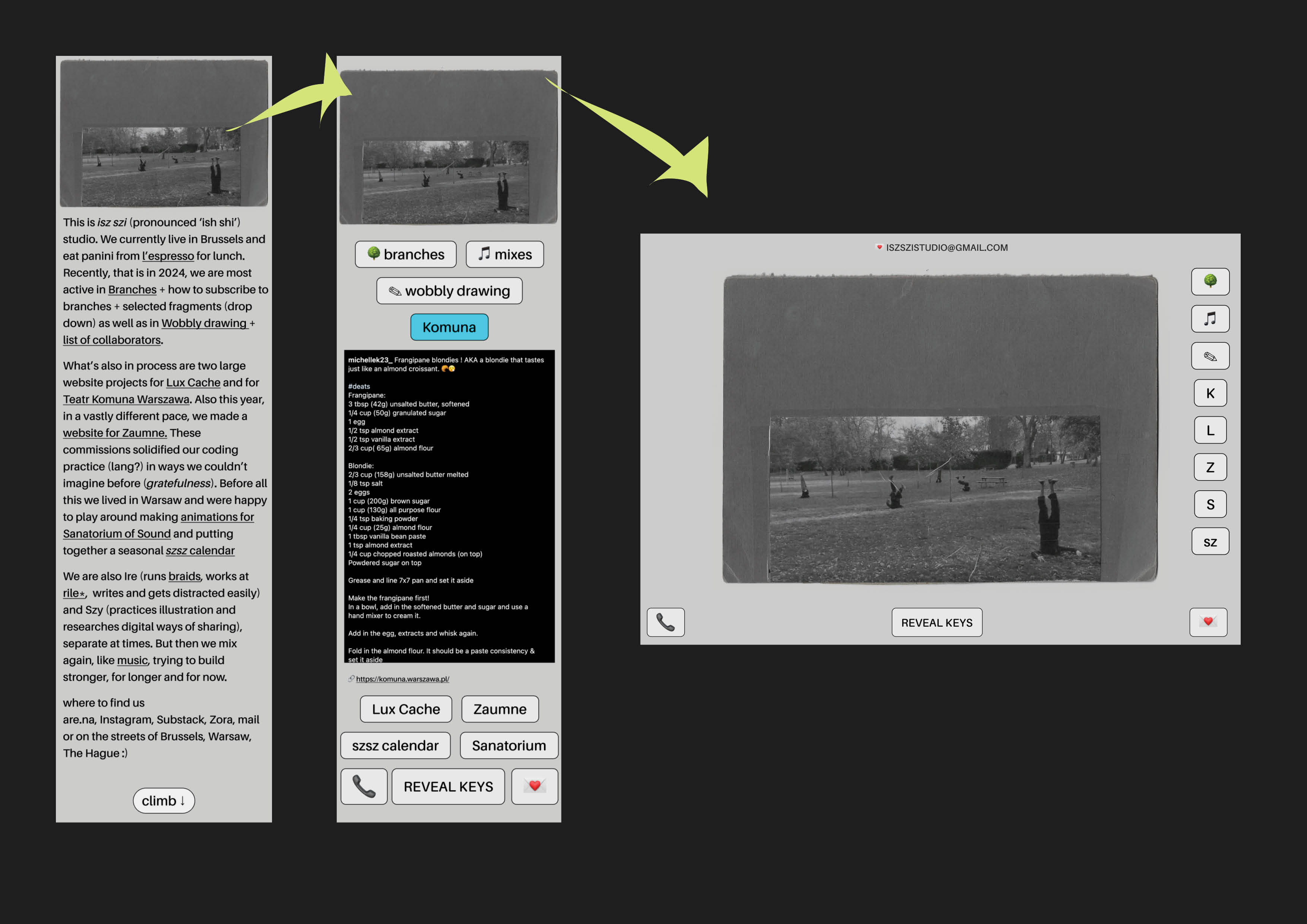 Coś co może nam pomóc w myśleniu o funkcjonalności! Linkowanie jest piękna praktyką, która podkreśla ryzomatyczność naszej rzeczywistości. Super przykład od AGF https://www.poemproducer.com/haus.php - strona, która wydaje się być ścieżkami strzałek, mapą, która nie przytłacza = szkicem mapy? Lub tutaj, fajny przykład linkowania paired with hardcore html: https://www.sophie.org.uk/